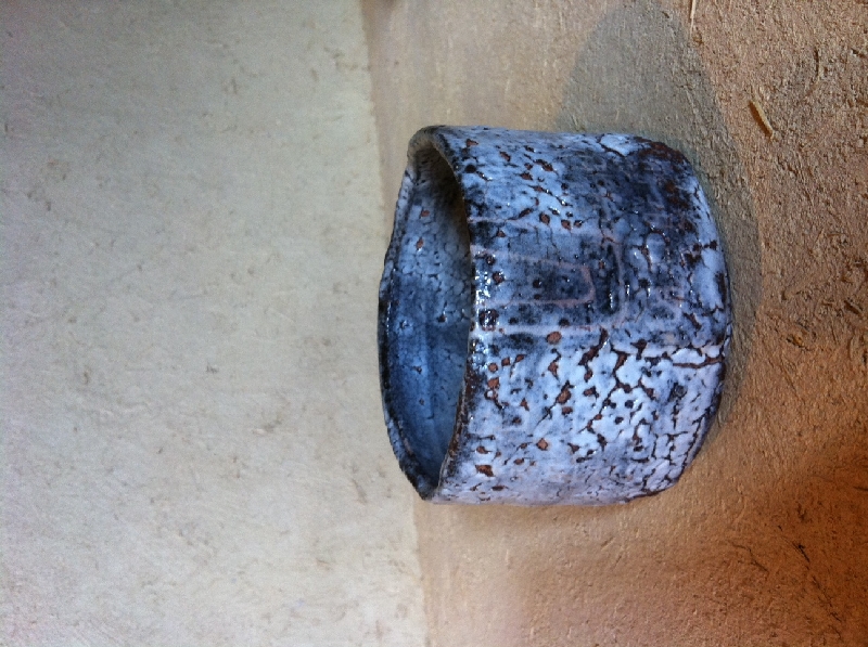 鬼ヶ島鼠志野は鉄で織部様式の模様と般若心経が彫られています。